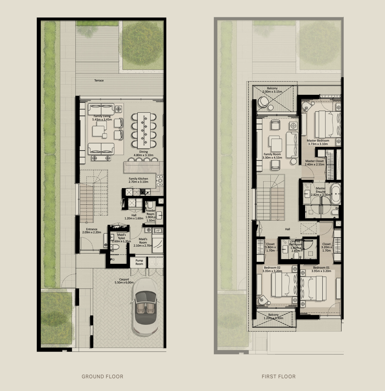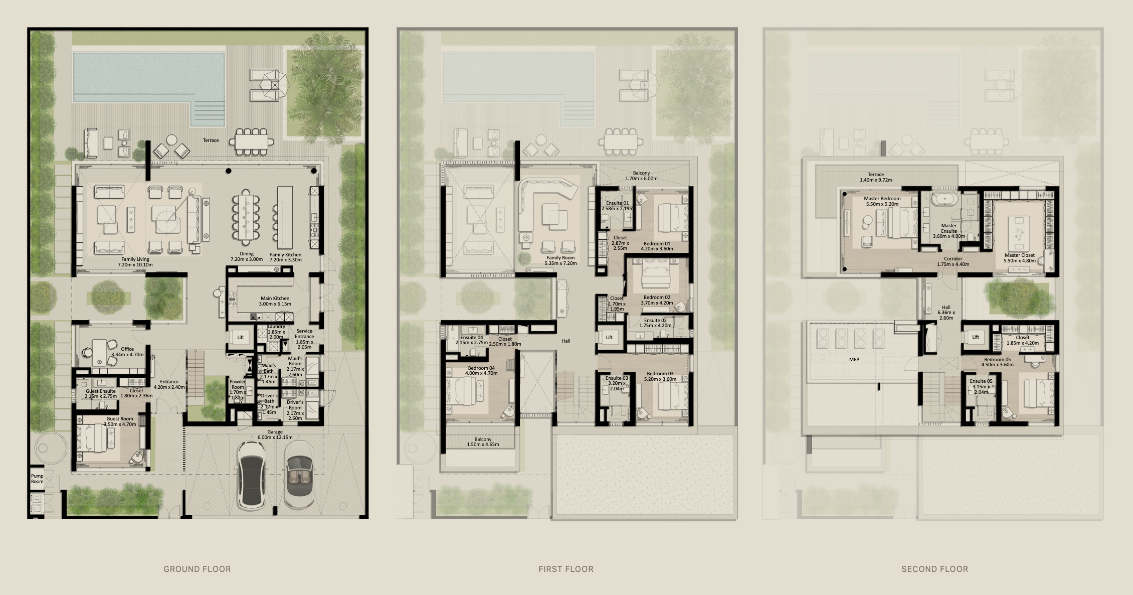 Amid scenic surroundings, these distinguished 5-bedroom villas feature a contemporary design with a light-beige base that rises gracefully to an elegant roof. The dynamic exterior, adorned with grey tones and brushed bronze accents, exudes sophistication and timeless appeal.