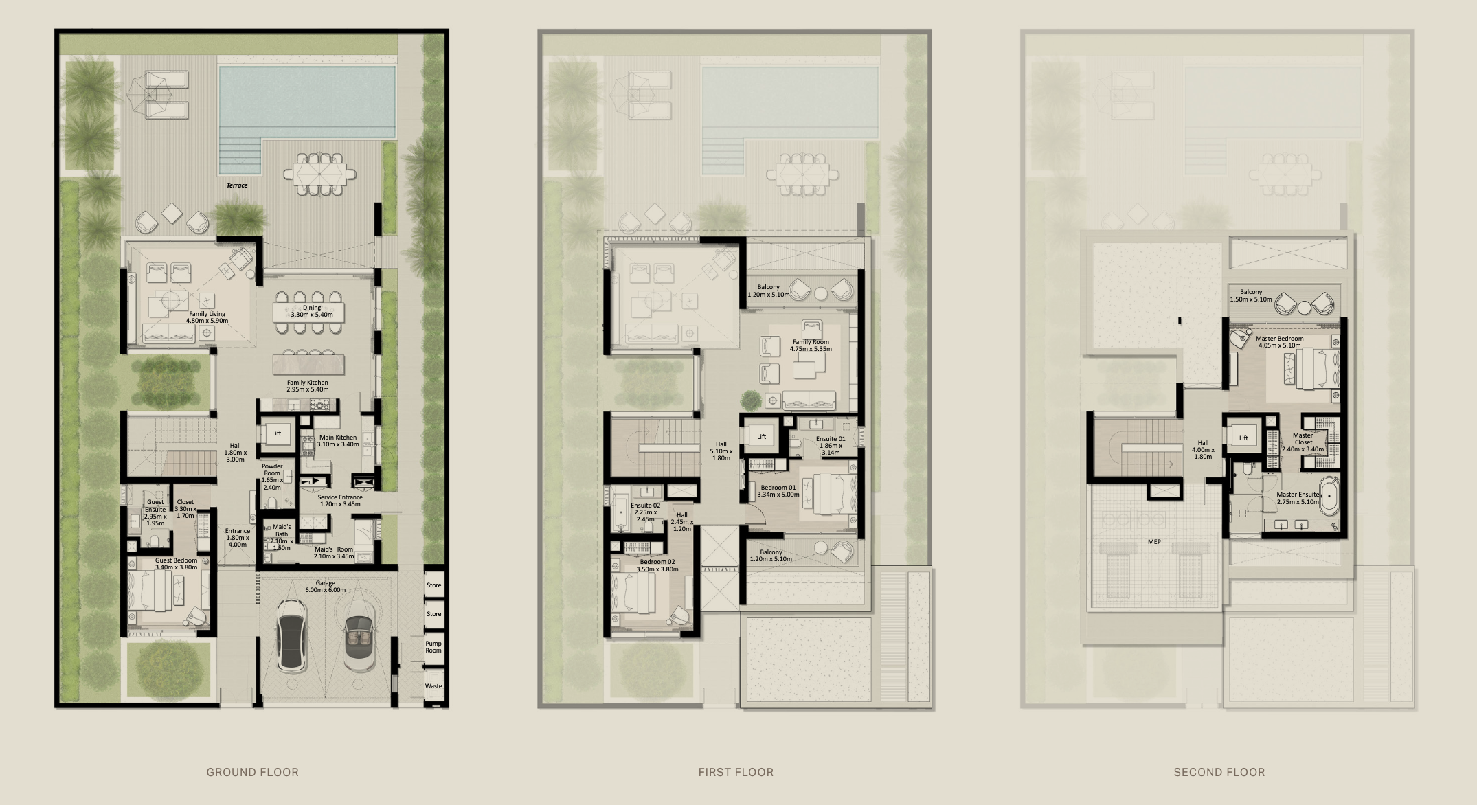Inside, the villas feature an open-plan layout anchored by a striking double-height living and dining area, spread across G+2 levels and equipped with a convenient lift. The first floor is designed for comfort and privacy, with two bedrooms and a family room overlooking the rear garden. The second floor is dedicated entirely to the master suite, which features a spacious walk-in closet, a luxurious ensuite bathroom, and