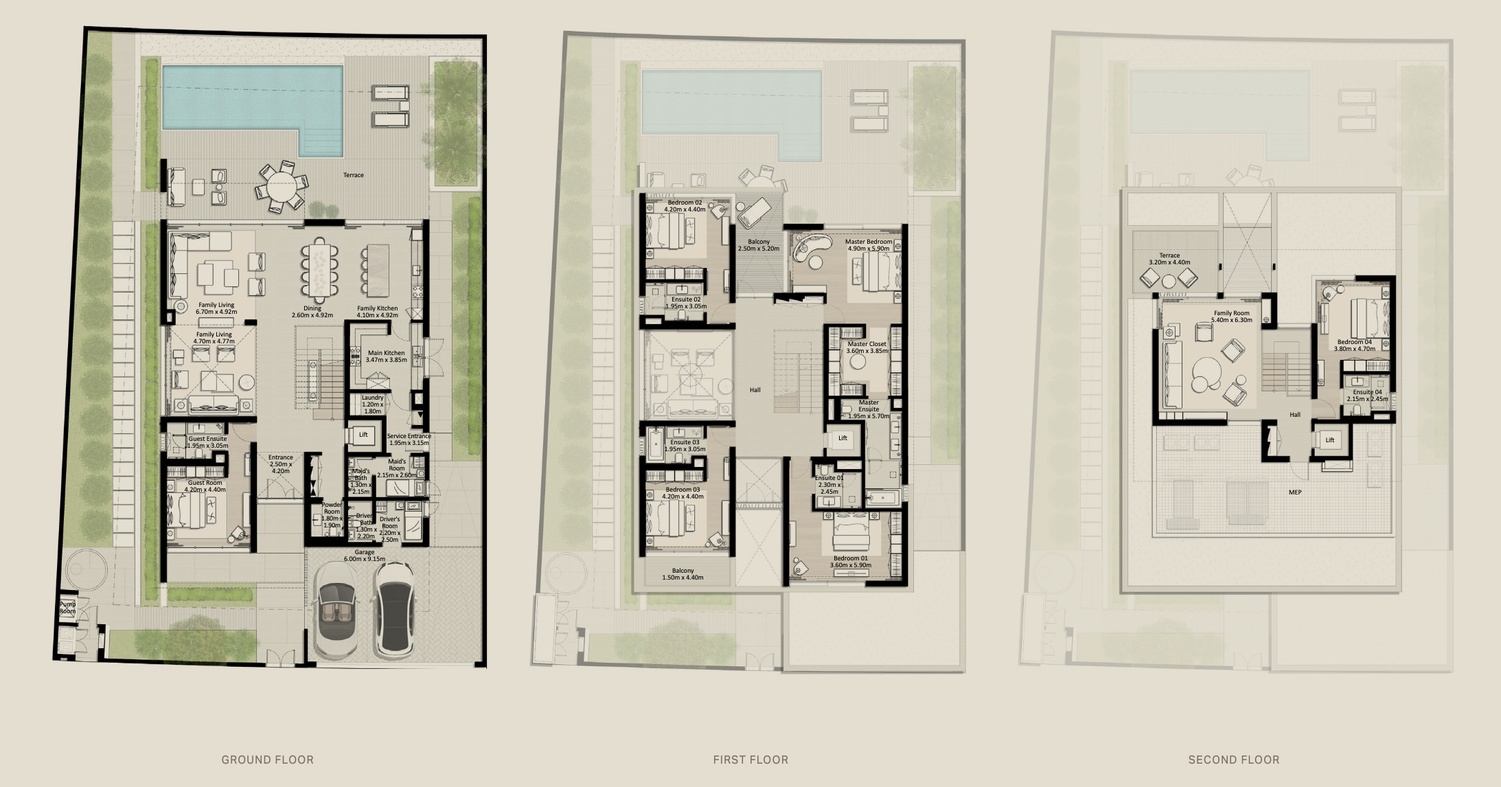 Inside, the ground floor offers a seamless flow of thoughtfully curated spaces, including formal and family living areas, a dining room, a show kitchen, and a guest bedroom. Upstairs, a spacious family room opens onto an expansive terrace, creating a private sanctuary of comfort and leisure for residents.
