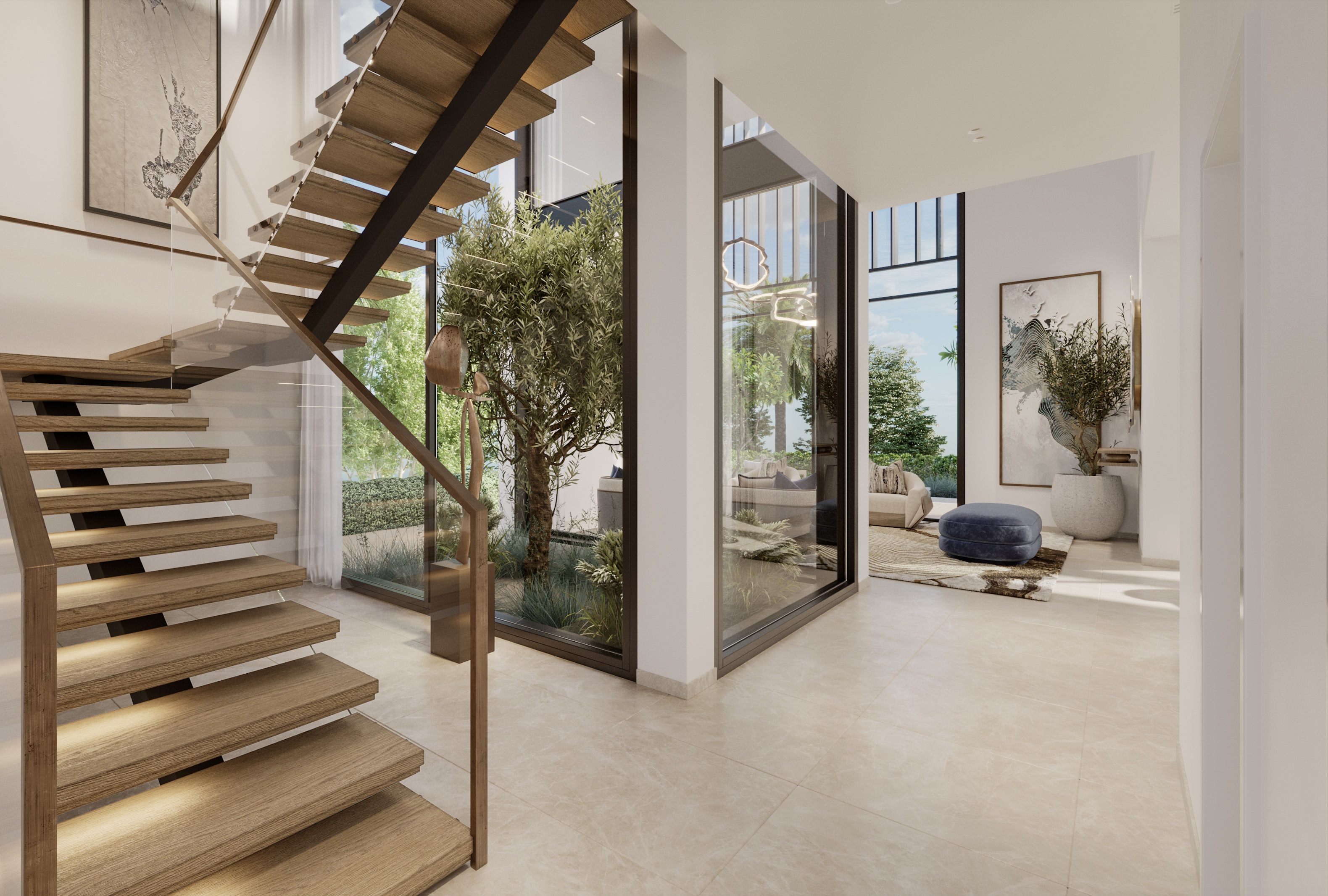 5-BEDROOM VILLAS | Amid scenic surroundings, these distinguished 5-bedroom villas feature a contemporary design with a light-beige base that rises gracefully to an elegant roof. The dynamic exterior, adorned with grey tones and brushed bronze accents, exudes sophistication and timeless appeal. Inside, the villas are thoughtfully designed with a welcoming open-plan layout. The expansive living and dining area is centred around a striking double-height space that seamlessly connects the entryway to the backyard. |