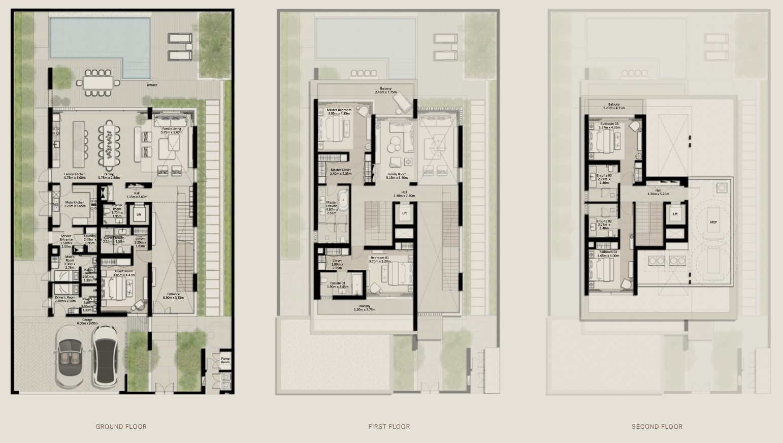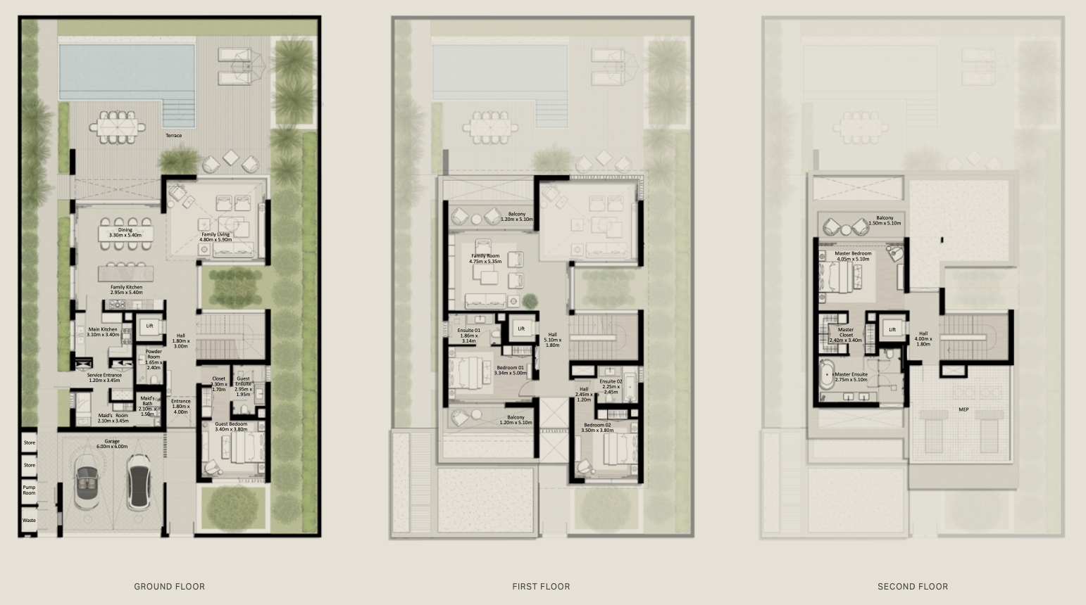 4-BEDROOM VILLAS | The front façade of the 4-bedroom villas captivates with its timeless aesthetic, while the rear design highlights expansive glass windows and stone-finish accents — a true testament to refined craftsmanship. Inside, the villas feature an open-plan layout anchored by a striking double-height living and dining area, spread across G+2 levels and equipped with a convenient lift. The first floor is designed for comfort and privacy, with two bedrooms and a family room overlooking the rear garden. The second floor is dedicated entirely to the master suite, which features a spacious walk-in closet, a luxurious ensuite bathroom, and a generous terrace. |