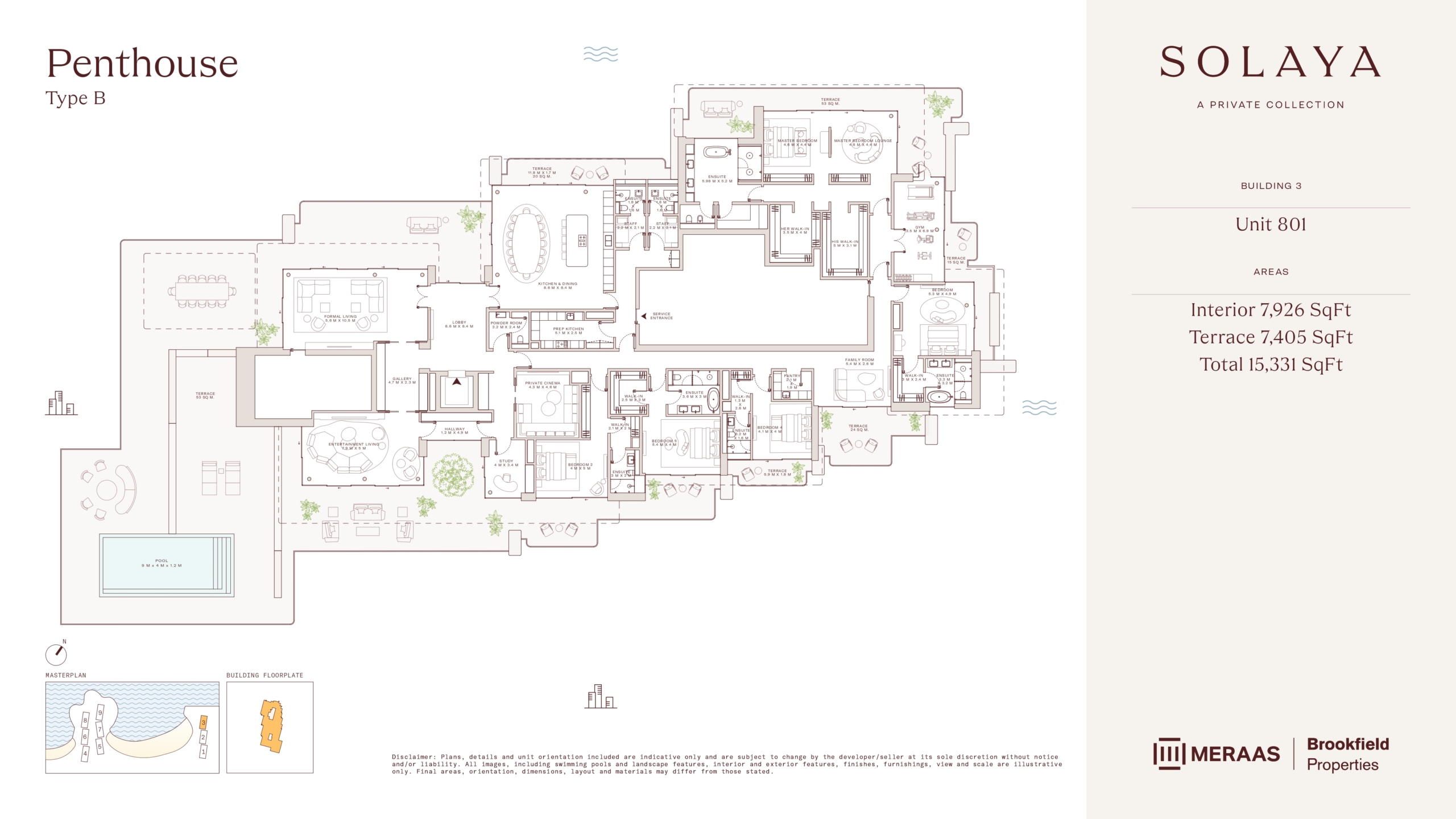 of 4 metres, creating a grand, spacious feel. Reflecting Solaya’s contemporary style, exclusive design details include high-end finishes, refined materials, bespoke furnishings, and understated hues. Each penthouse has a gym, spa, show kitchen, private cinema, private pool deck, entertainment living spaces, and additional staff accommodation.