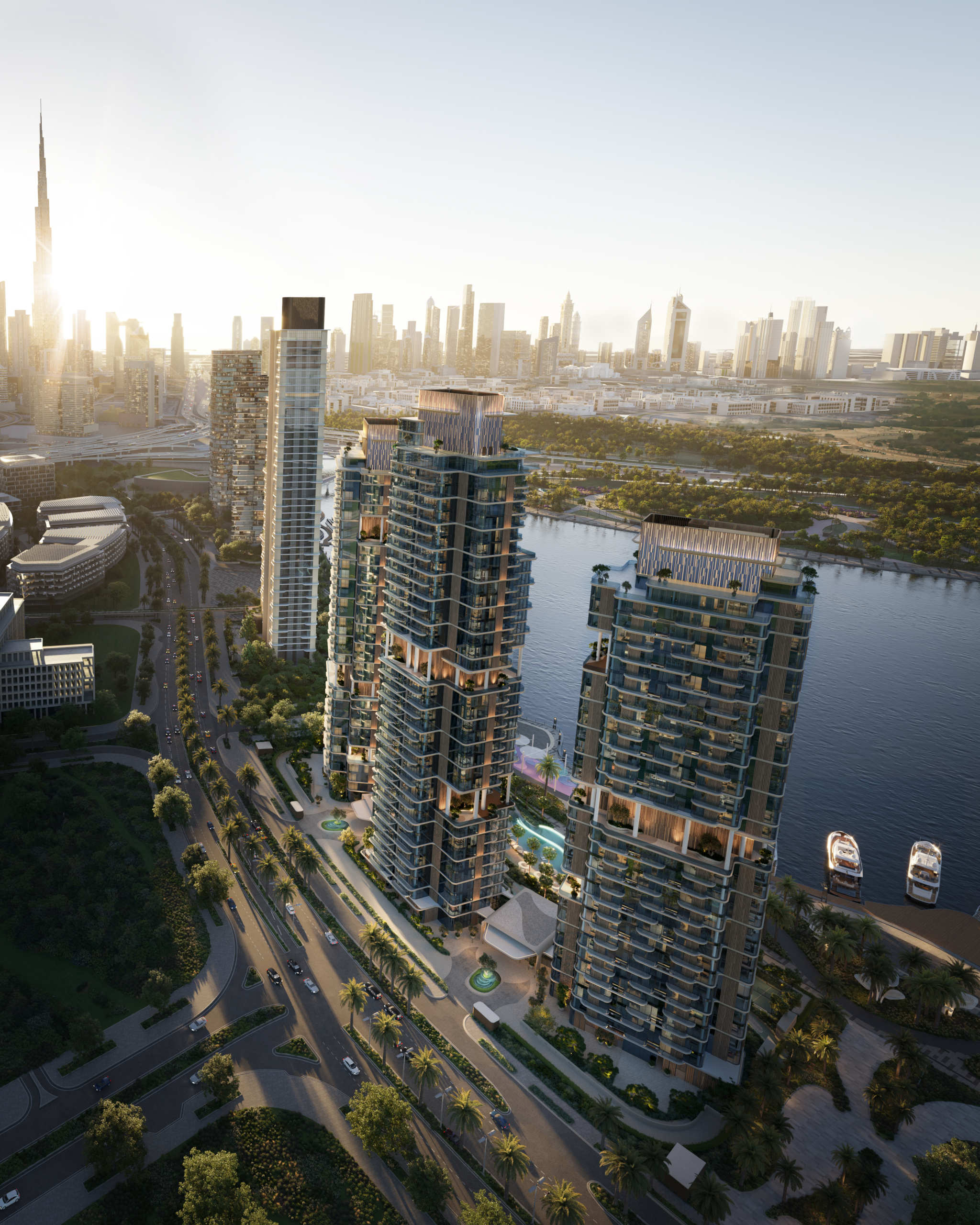 Gracefully positioned along the waterfront, this architectural trio strikes a balance between bold presence and quiet elegance. Terraces ripple like water, while elevated sky gardens blur the line between nature and structure, blending landscape and skyline with effortless fluidity.